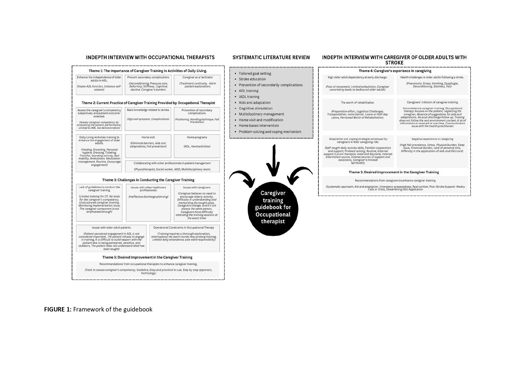 Competent caregivers play a pivotal role in supporting the functional abilities of older individuals. A decline in functional activities among older adults with stroke links to various health issues, prolonged hospital stays, re-hospitalisation and ultimately contributes to an increased burden on the healthcare system. Therefore, effective training of caregivers is crucial. This study aims to develop and validate a guidebook for occupational therapists to help caregivers improve daily functioning in older stroke patients.We developed the guidebook through a three-phase, multi-method process. Phase 1 defined its content and features using literature reviews and interviews with therapists and caregivers. In Phase 2, we validated the guidebook with expert focus groups. Phase 3 improved its clarity, cultural relevance and user understanding via cognitive interviews. The guidebook comprises three sections encompassing 11 topics and 72 subtopics. Its unique attributes, including structured caregiver training, a client-centered and goal-directed approach, post-discharge support, emergency preparedness, and strategies for caregiver coping and adaptation, demonstrated outstanding face and content validity. These features achieved a perfect score of 1.0 in both Content Validity Index (CVI) and Content Knowledge Index (CKI). The guidebook holds potential for clinical application, necessitating further research to evaluate its feasibility and effectiveness in clinical settings.