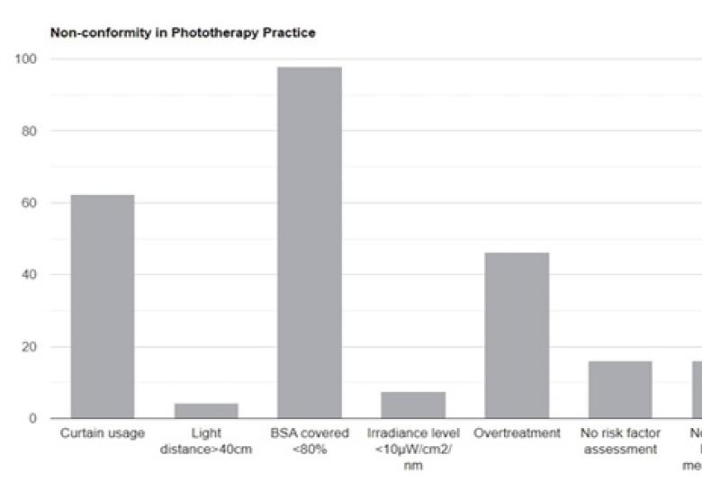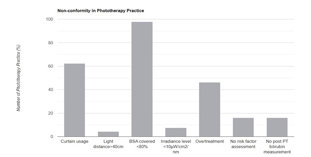 Panduan untuk pengurusan hiperbilirubinemia dalam bayi baru lahir telah ditetapkan baru-baru ini di Indonesia, tetapi penerimaan dan pematuhan oleh para doktor terhadap tahap piawai ini tidak diketahui. Objektif kajian ini adalah untuk menilai keadaan semasa ini bagi amalan fototerapi dan menentukan sama ada ini sejajar dengan Panduan Hiperbilirubinemia Indonesia. Kajian ini dilakukan di unit penjagaan neonatal Hospital Dr. Soetomo di Surabaya, Indonesia. Kami menilai semua bayi yang menjalani fototerapi antara September 2019 dan September 2020. Kesesuaian dengan elemen teras dalam panduan kebangsaan dinilai dalam pengurusan hiperbilirubinemia untuk 89 bayi, dua pertiga daripadanya ialah bayi pramatang dan mempunyai berat lahir yang rendah. Sepertiga daripada bayi memulakan fototerapi hanya berdasarkan dengan pengukuran bilirubin melalui kulit. Sebahagian besar daripada bayi menghentikan fototerapi tanpa penilaian tahap bilirubin atau pengesahan bahawa penyakit kuning telah berkurang dengan ketara. Hampir semua (95.9%) sesi fototerapi tidak mematuhi panduan, di mana yang paling kerap ialah kekurangan pendedahan permukaan badan kepada cahaya. Walaupun panduan disesuaikan untuk menjadi pragmatik dan dapat digunakan dalam konteks tempatan, para pengamal kesihatan tidak mematuhi dengan sepenuhnya, menyebabkan penilaian semula yang segera terhadap pelaksanaan dan penerimaan panduan hiperbilirubinemia semasa adalah diperlukan.